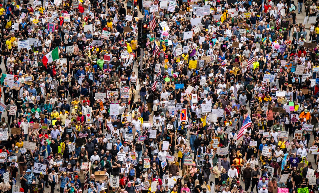 “NO KINGS”, con letras mayúsculas fue la consigna y sentencia que resonó por parte de la sociedad estadounidense desde Chicago hasta nueva York, desde Washington a Los Ángeles, y de Austin hasta Cincinnati, San Diego, San Francisco, Boston y Atlanta, entre las 2,700 ciudades y pueblos del país más poderoso del mundo que se sacudió con manifestaciones mayúsculas y pacíficas de la Costa Este a la Oeste y de la frontera de México a la de Canadá, repudiando lo que llamaron la “agenda autoritaria del presidente Trump” y la de su movimiento MAGA y comparándolo con tiranos y dictadores como Adolf Hitler.