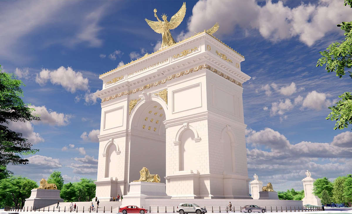 El diseño, presentado por el secretario del Interior, Doug Burgum, y el arquitecto Nicholas Charbonneau, describe una mole de piedra coronada por una estatua de la Dama Libertad en bronce dorado de 18 metros de altura, flanqueada por dos águilas. En sus paredes se inscribirían las frases “One Nation Under God” y “Liberty and Justice for All”.