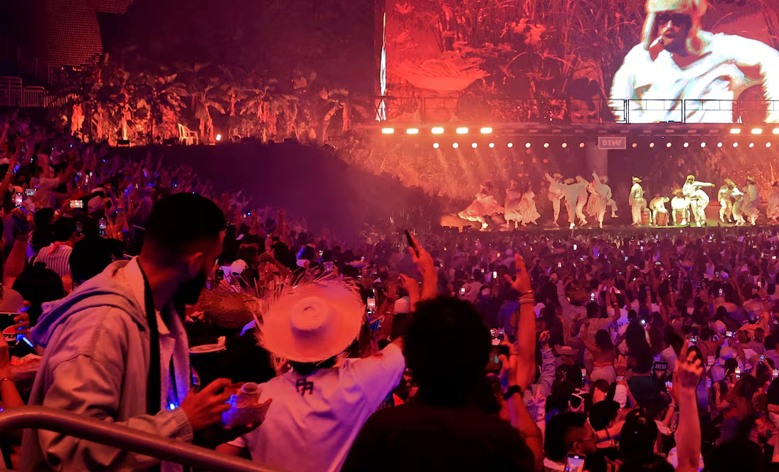 Y es que, en los videos que ya circulan en diferentes plataformas, se puede ver el momento exacto en el que las luces se apagaron, las pantallas quedaron en negro y, ante las dudas de los asistentes, un mensaje apareció en las pantallas: Bad Bunny les interpretaría una canción sorpresa: