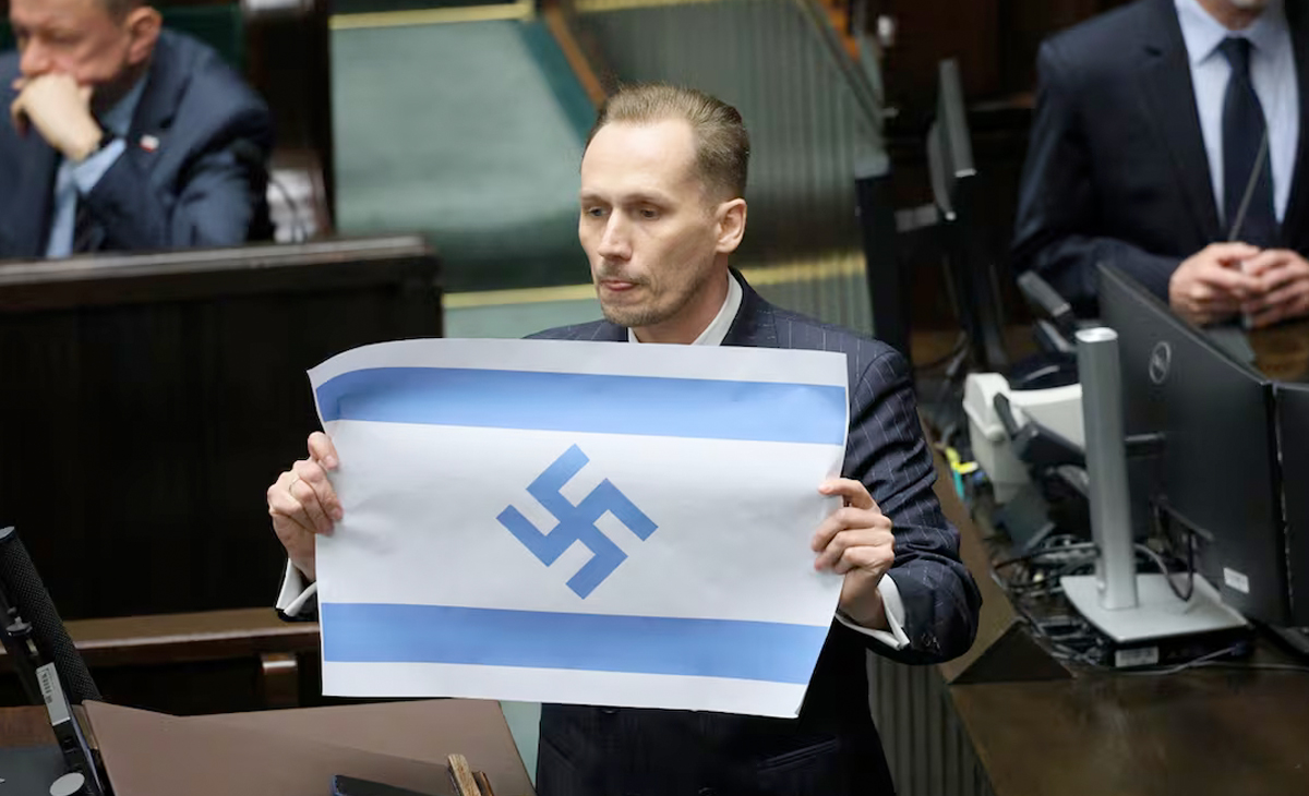 Cracovia, Polonia.— El diputado de Polonia, Konrad Berkowicz, de la formación ultranacionalista Confederación, provocó una oleada de protestas al mostrar durante su intervención desde la tribuna del Parlamento una bandera de Israel modificada con una esvástica nazi en lugar de la estrella de David.
