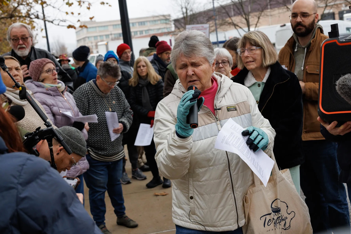 Algunos llevaban cuellos clericales y estolas ministeriales. Muchos eran mayores, con canas asomando bajo gorros de invierno. Tras las canciones y los discursos, la multitud se giró hacia el edificio para un minuto de oración en silencio.