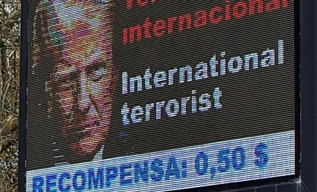“BÚSCASE. WANTED”, se lee en un anuncio en la localidad de Oleiros, en la comunidad autónoma de Galicia, junto a la foto del mandatario estadounidense y las palabras “Terrorista internacional”, en español e inglés.