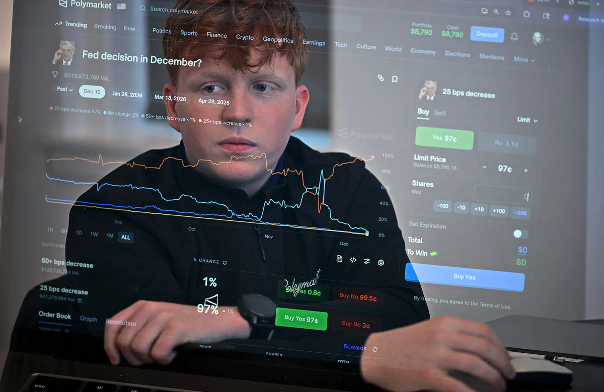 Este estudiante de primer año de la Universidad de Chicago está en Polymarket, observando en tiempo real cómo los usuarios apuestan sobre si las tasas de interés subirán en las próximas semanas. La plataforma, basada en criptomonedas, permite a los usuarios apostar —mediante la compra y venta de contratos— sobre los resultados de eventos futuros.