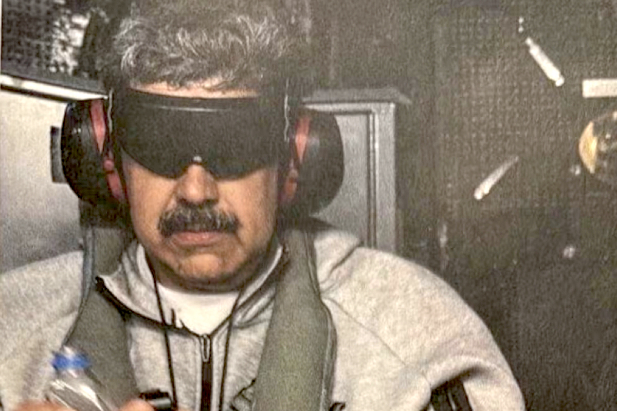 En la foto se puede observar al líder chavista esposado con los ojos y oídos tapados, usando una sudadera gris mientras sostiene una botella de agua, a bordo de un buque militar de EEUU en el Caribe.