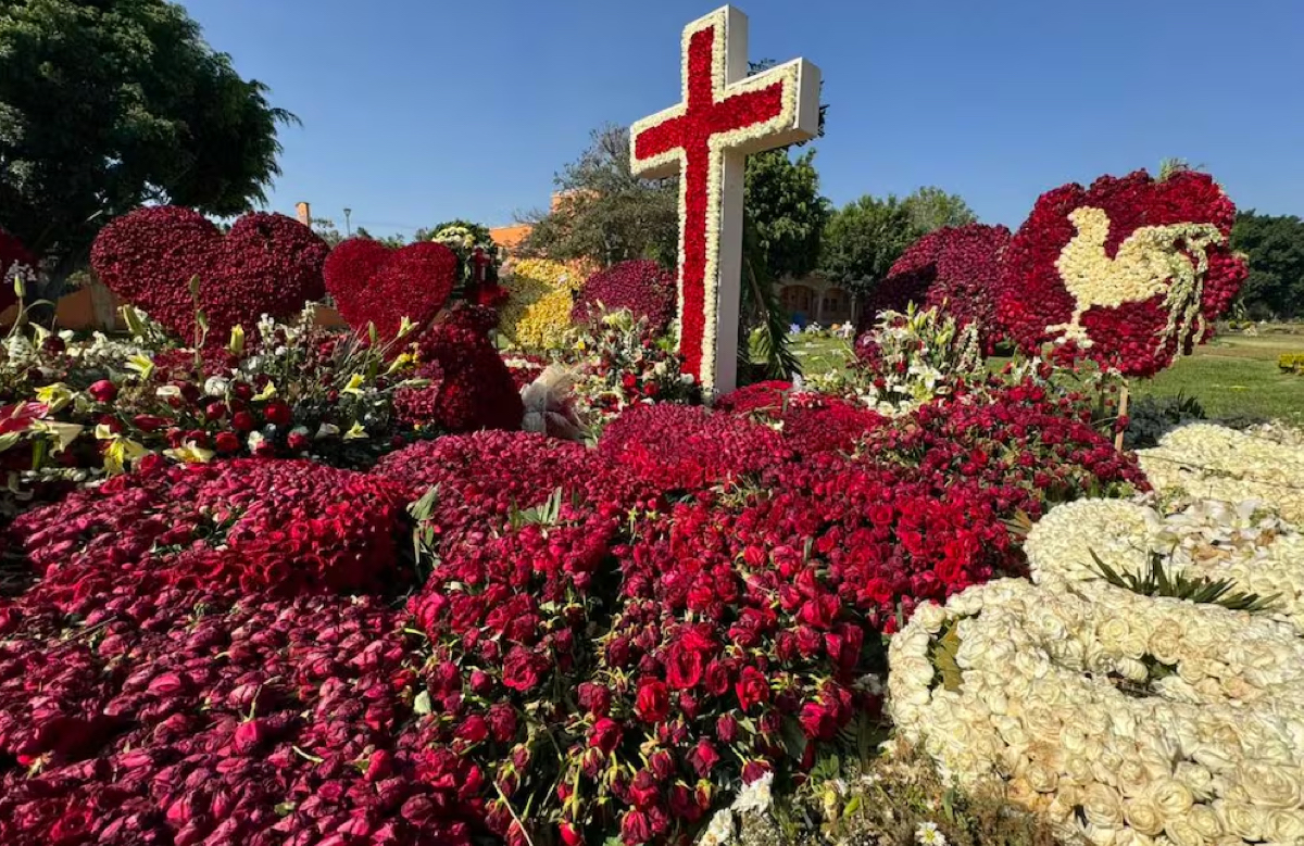 De entre los ornamentos sobresale la frase “Te amo bebé”, en la parte inferior; a la derecha, un atril de madera sostiene una corona con un gallo de cuerpo y patas hecho con rosas blancas que resalta de un fondo rojo intenso confeccionado con más flores del mismo género botánico.